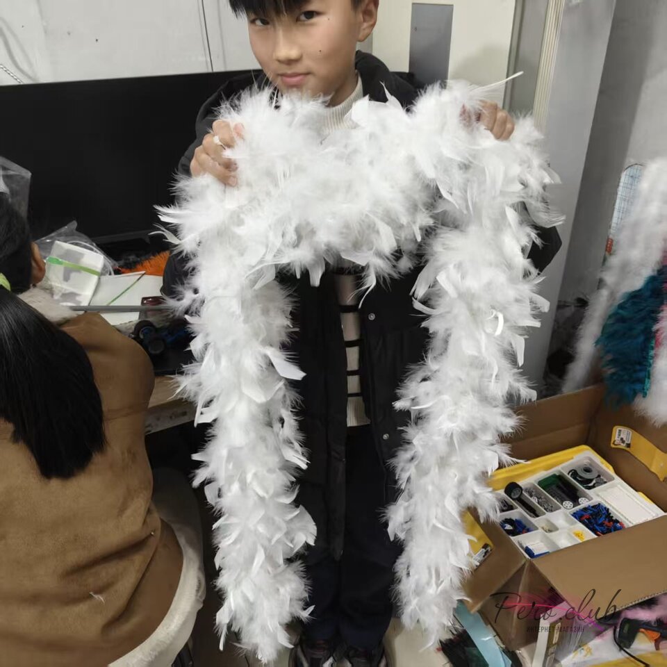 Белое боа 80 г выглядит более объёмно и создаёт мягкий, светлый акцент в образе. Подходит для свадебных фотосессий, сцены и праздникoв.