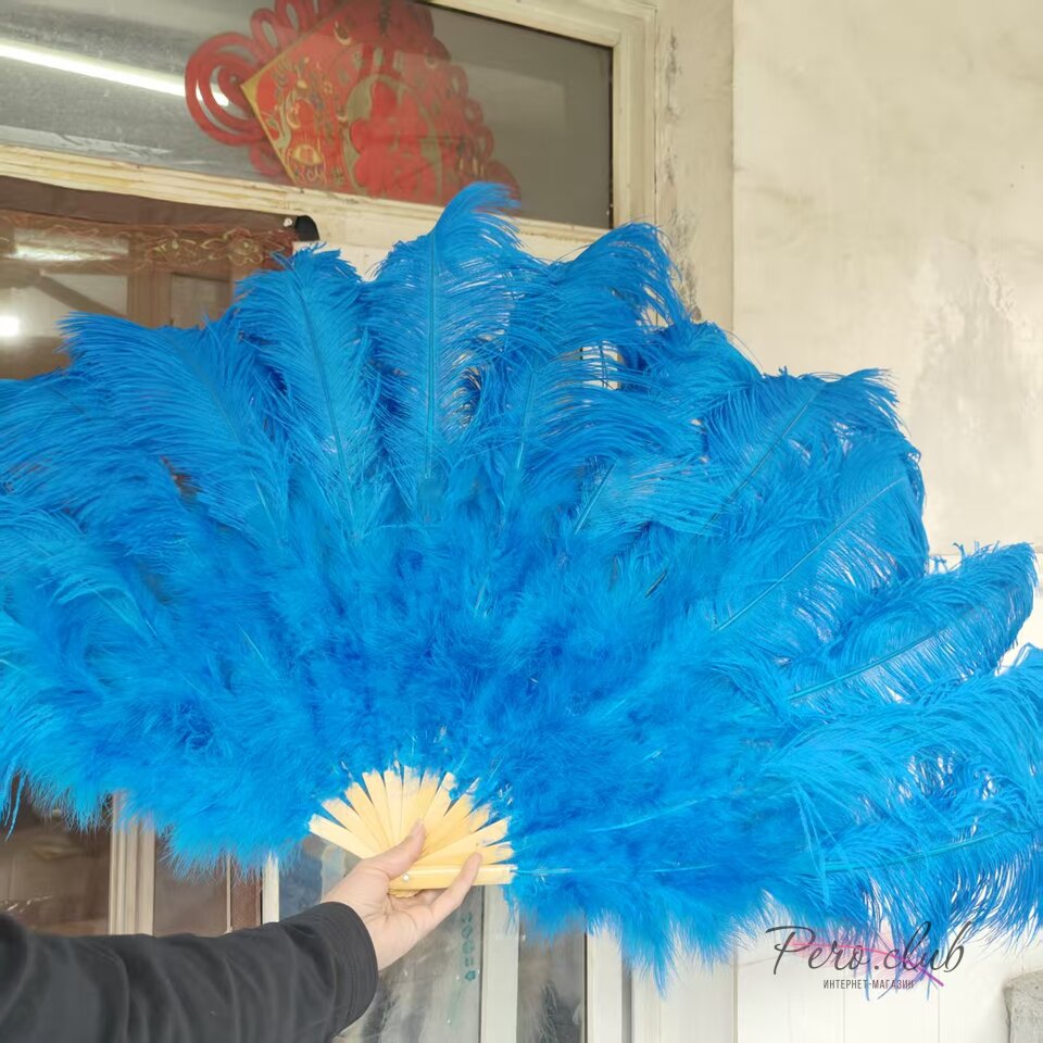 Размер веера составляет 140×75 см, благодаря чему он выглядит масштабно и выразительно на сцене, в фотозонах и во время выступлений. Голубой цвет выглядит нежно и свежо, отлично подходит для фотосессий, свадебных образов, театральных постановок, шоу и дизайнерских проектов.
